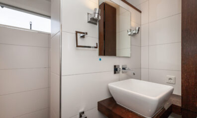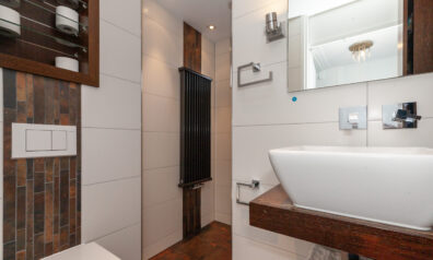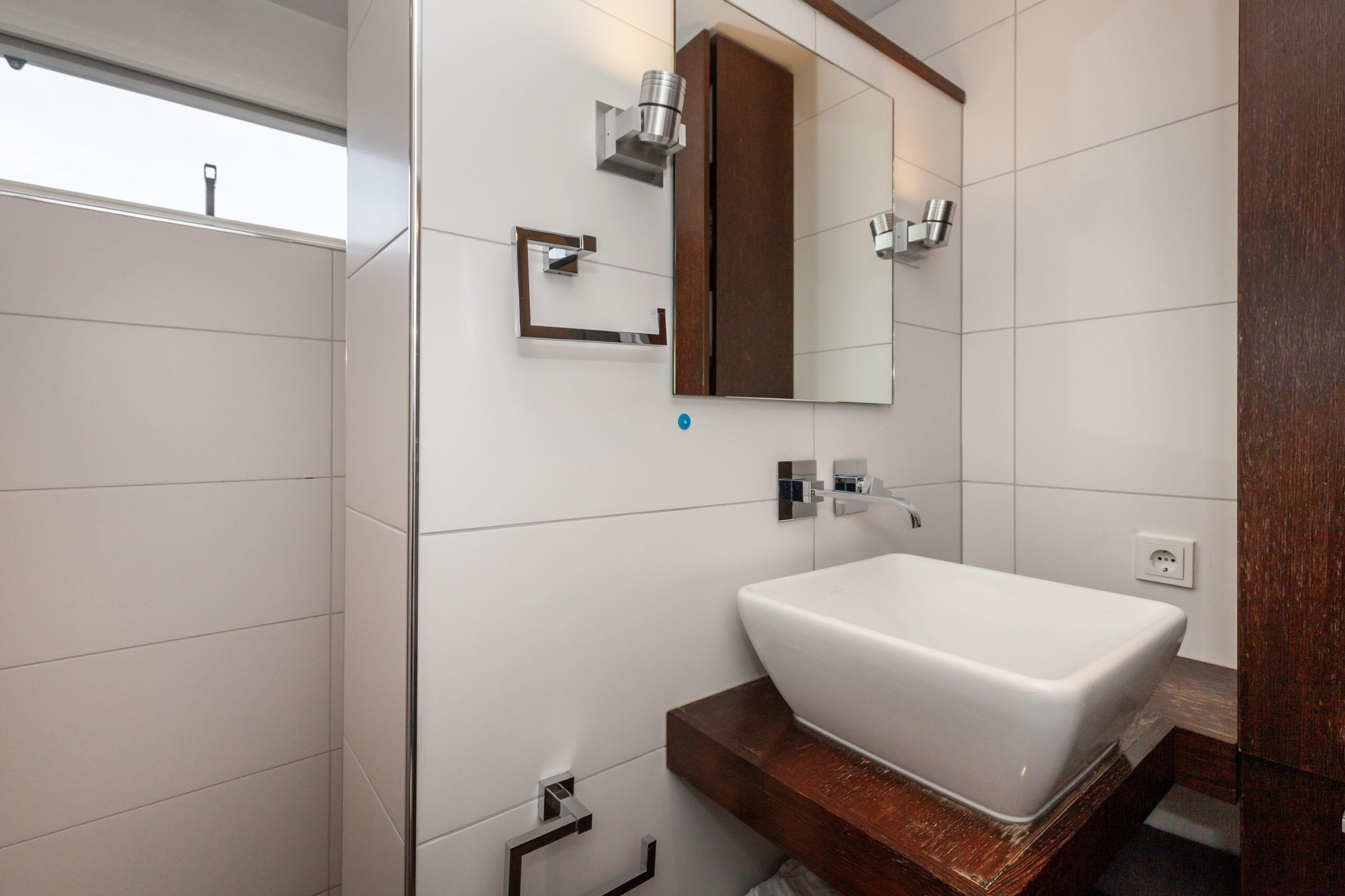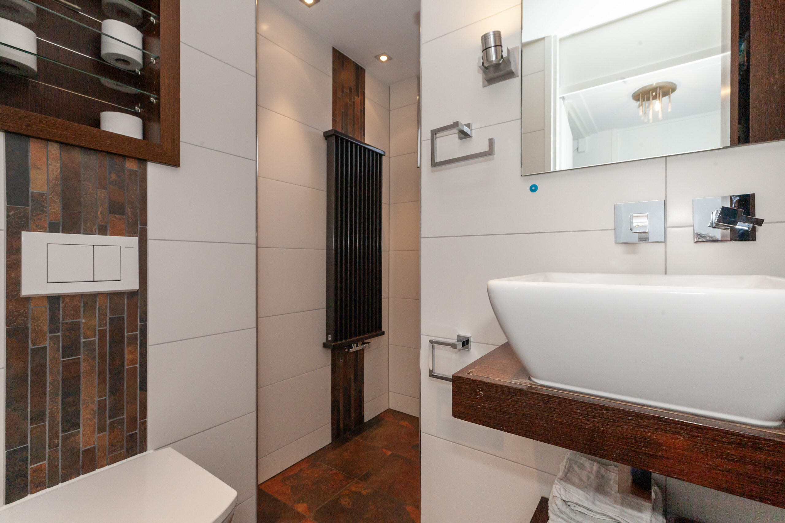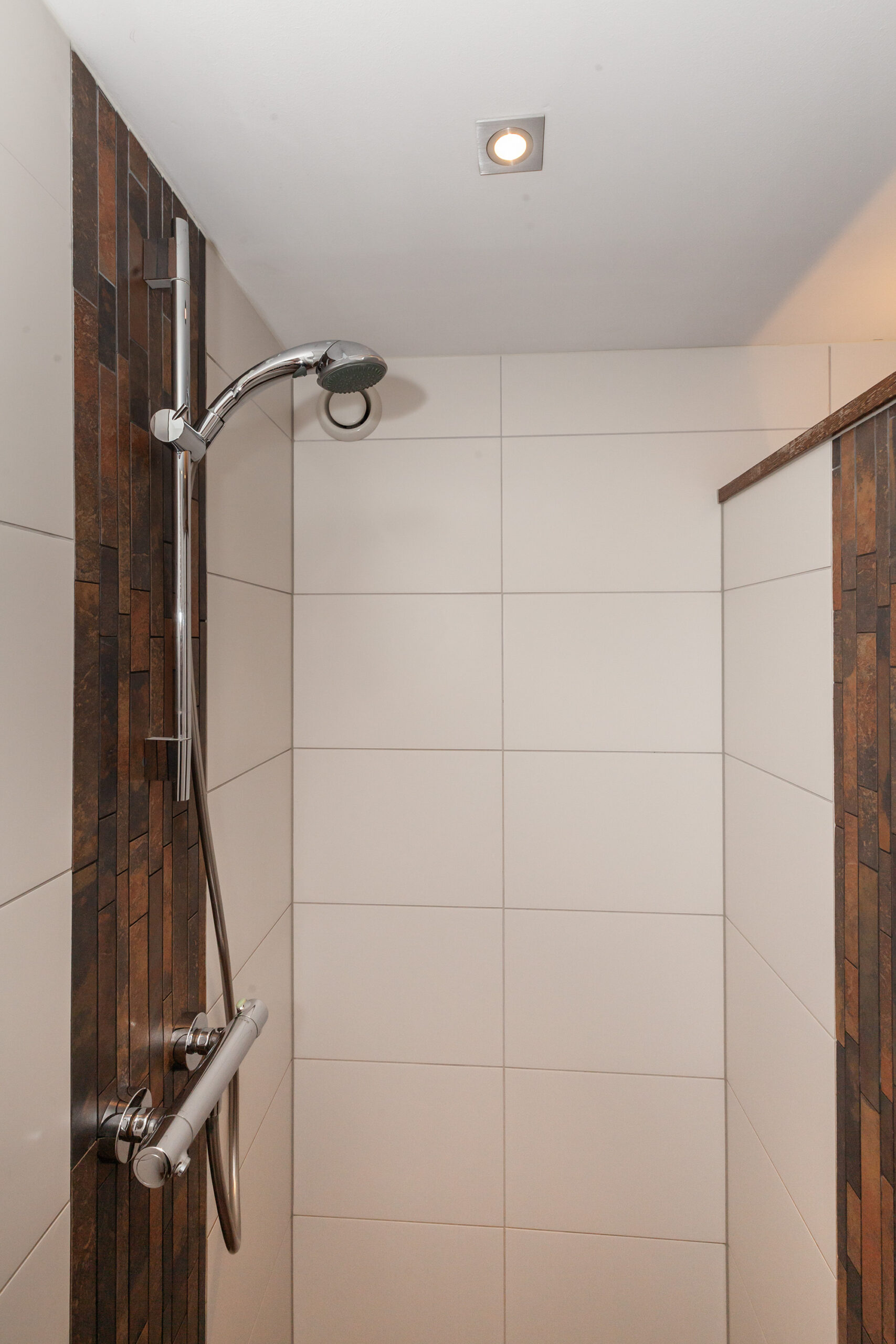 De badkamer is afgewerkt in een moderne stijl. U heeft de beschikking over een wastafel, toilet en een ruime inloopdouche.
