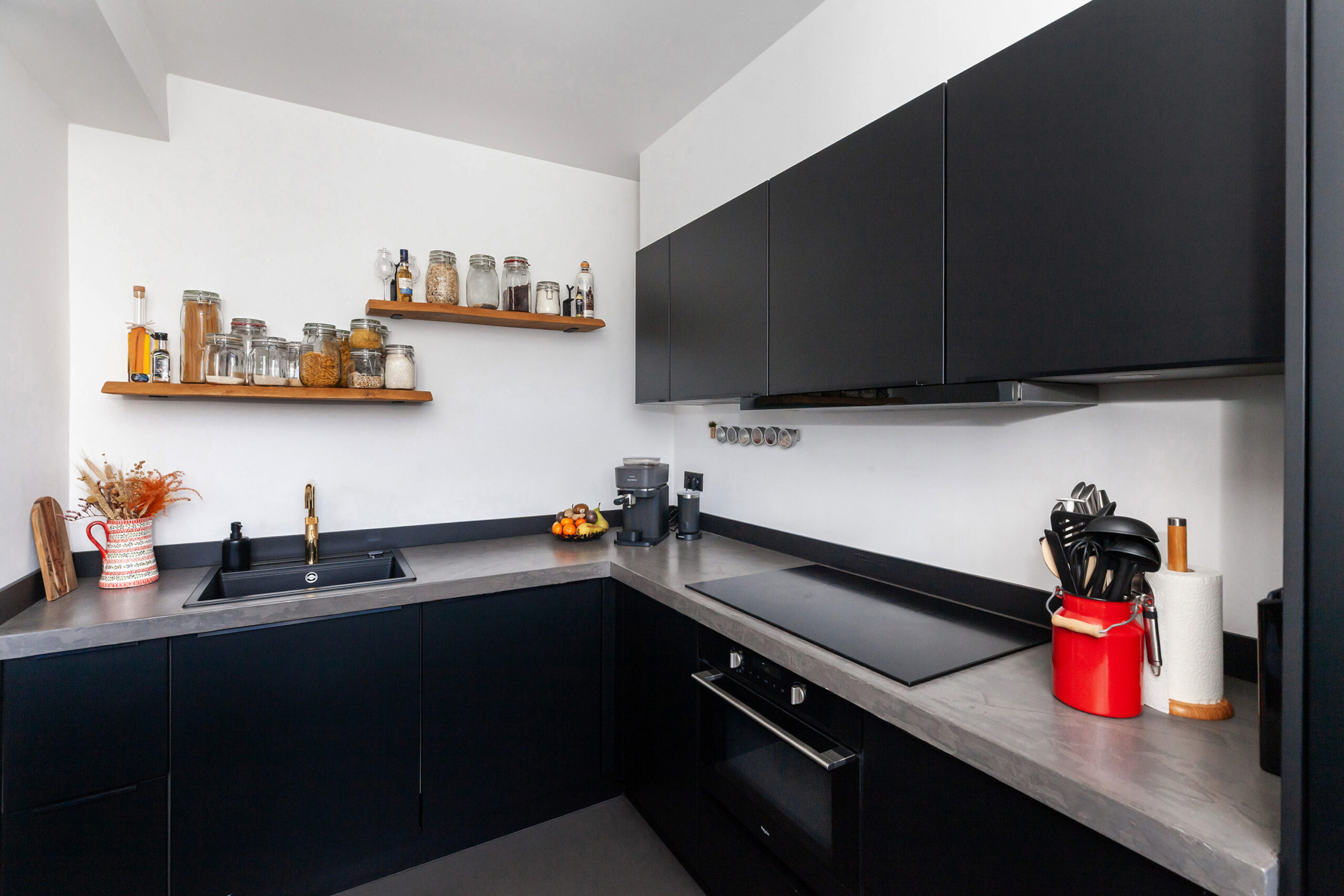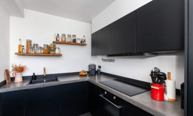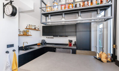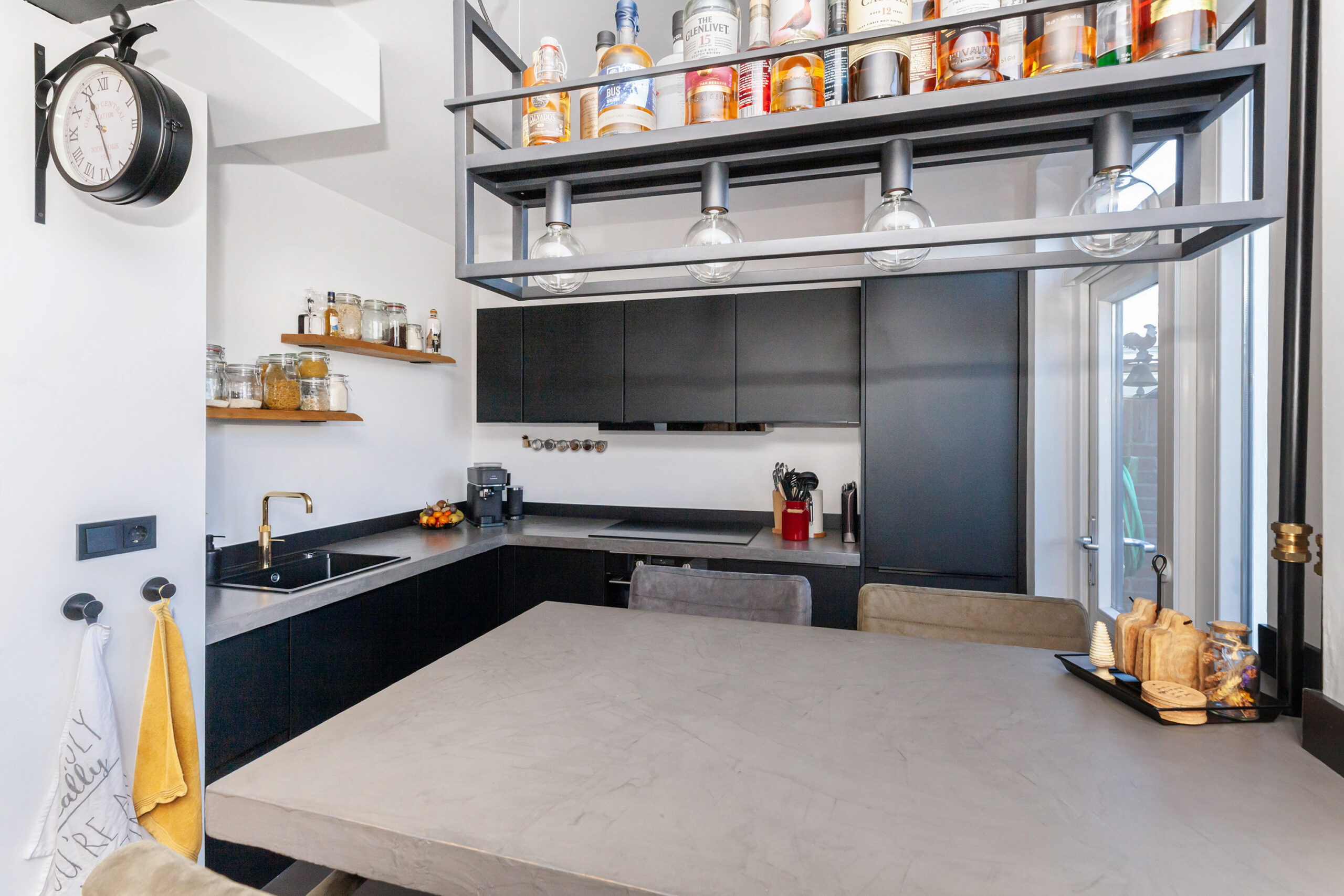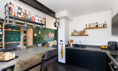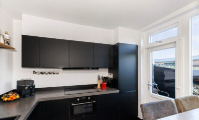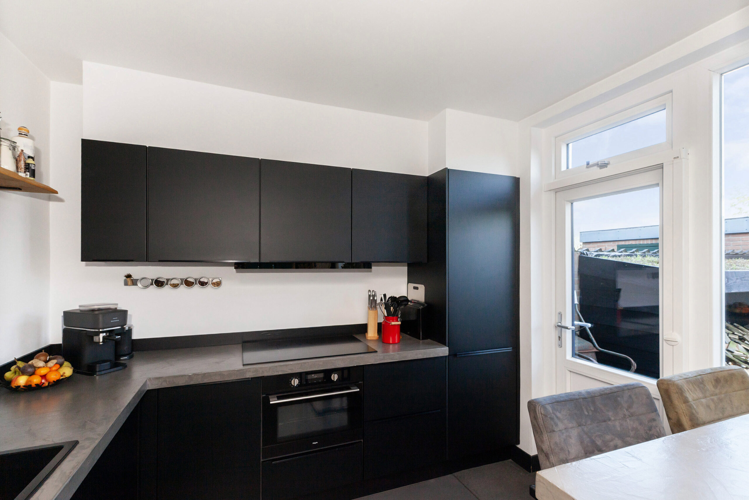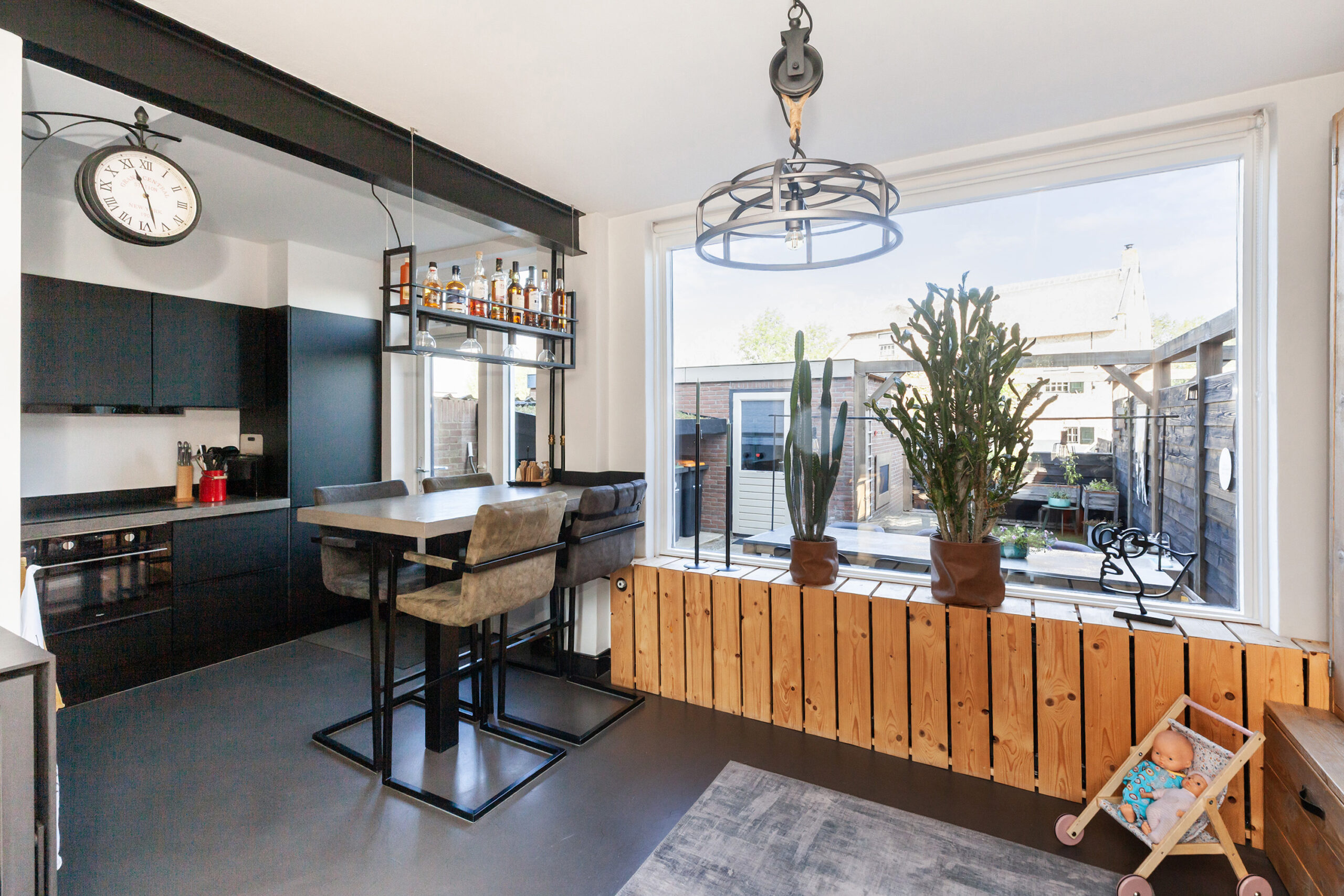 De hoekkeuken heeft een warme, moderne look met donkere kasten in combinatie met de goudkleurige Quooker. Aan inbouwapparatuur is er de beschikking over een inductiekookplaat, afzuigkap, koel-/vriescombinatie, vaatwasser en combimagnetron. Via de achterdeur (voorzien van kunststof kozijnen) kunt u naar de tuin. En zegt u het zelf; deze eethoek is toch een sfeertje!