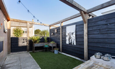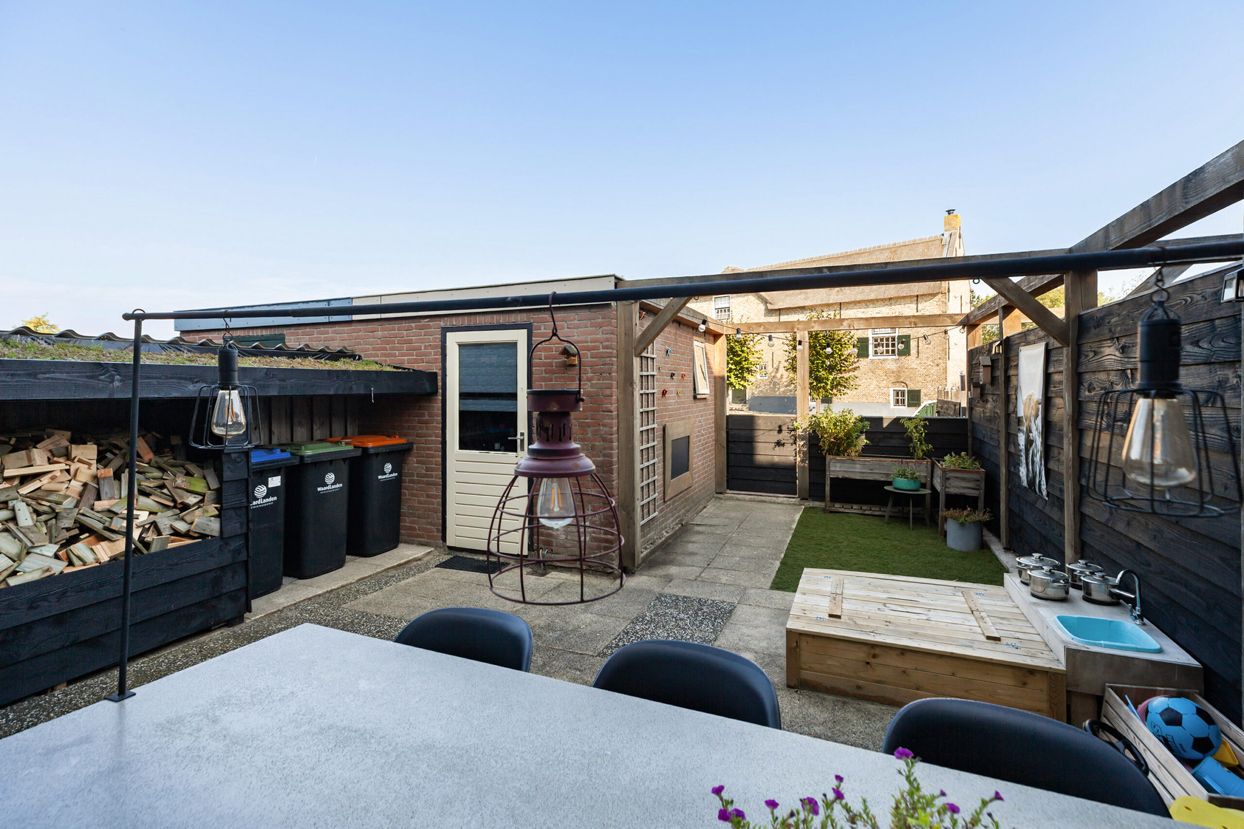 De achtertuin is onderhoudsvriendelijk aangelegd met bestrating en kunstgras. Direct achter de woning is een groot terras met de houtopslag voor de kachel. Loopt u verder dan komt u bij de stenen berging van circa 3.83 x 2.62m. Erachter ligt een pad waar recht van overpad op is gevestigd zodat u achterom kunt komen, maar ook uw buren over dit pad mogen komen en gaan.