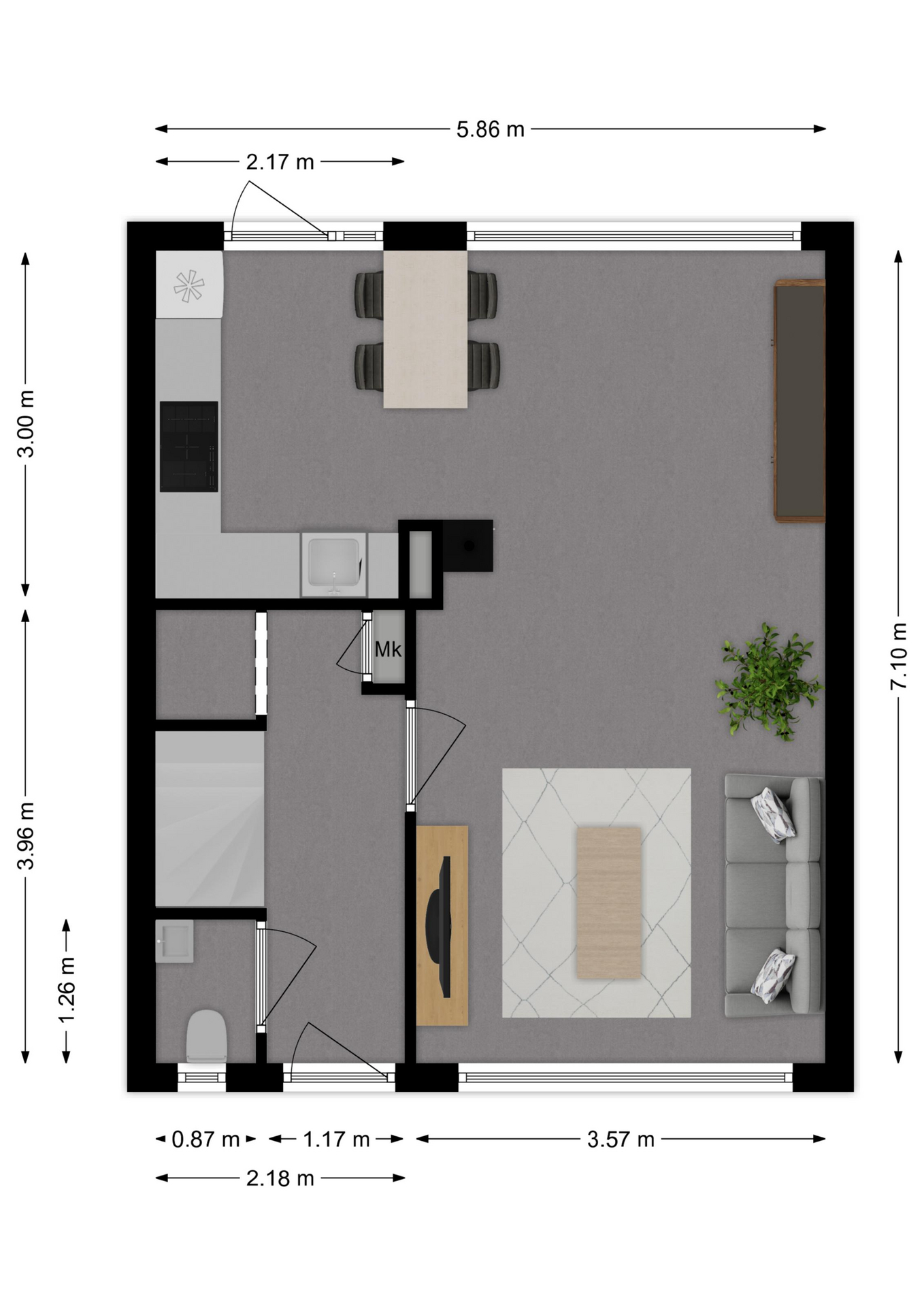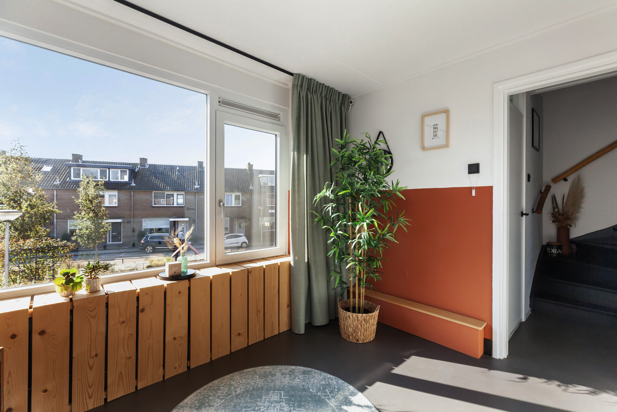 U stapt binnen in een ruime hal waar u de toiletruimte, trapopgang, trapkast en meterkast heeft. Verder is er een garderobe voor het ophangen van de jassen en toegang tot de woonkamer.