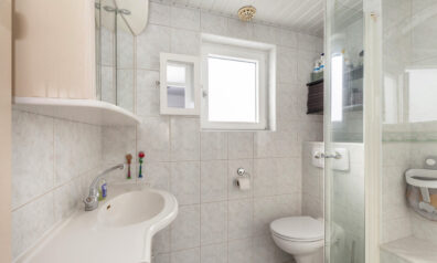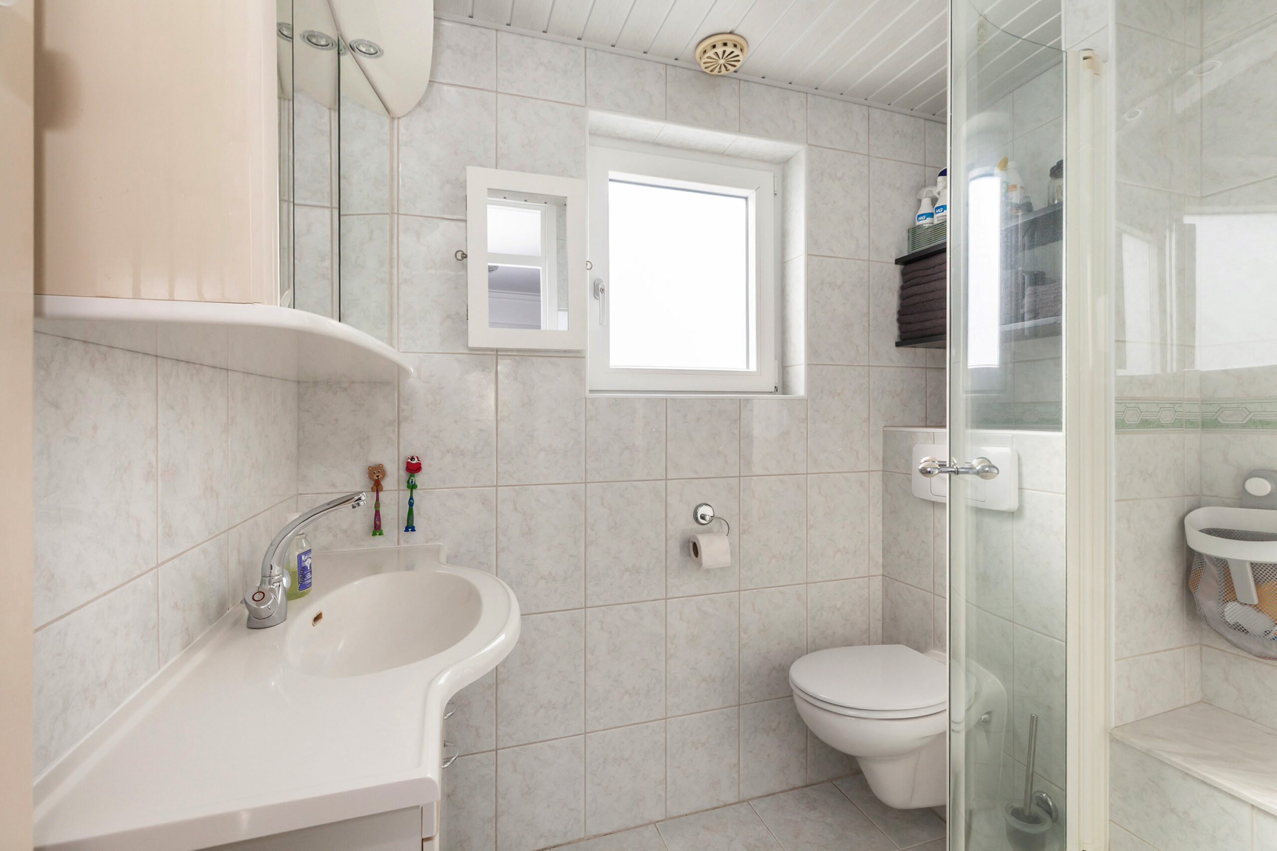 De badkamer is aan de voorzijde gesitueerd en voorzien van een douche, toilet en een wastafelmeubel. Het warm water komt via de elektrische boiler.
