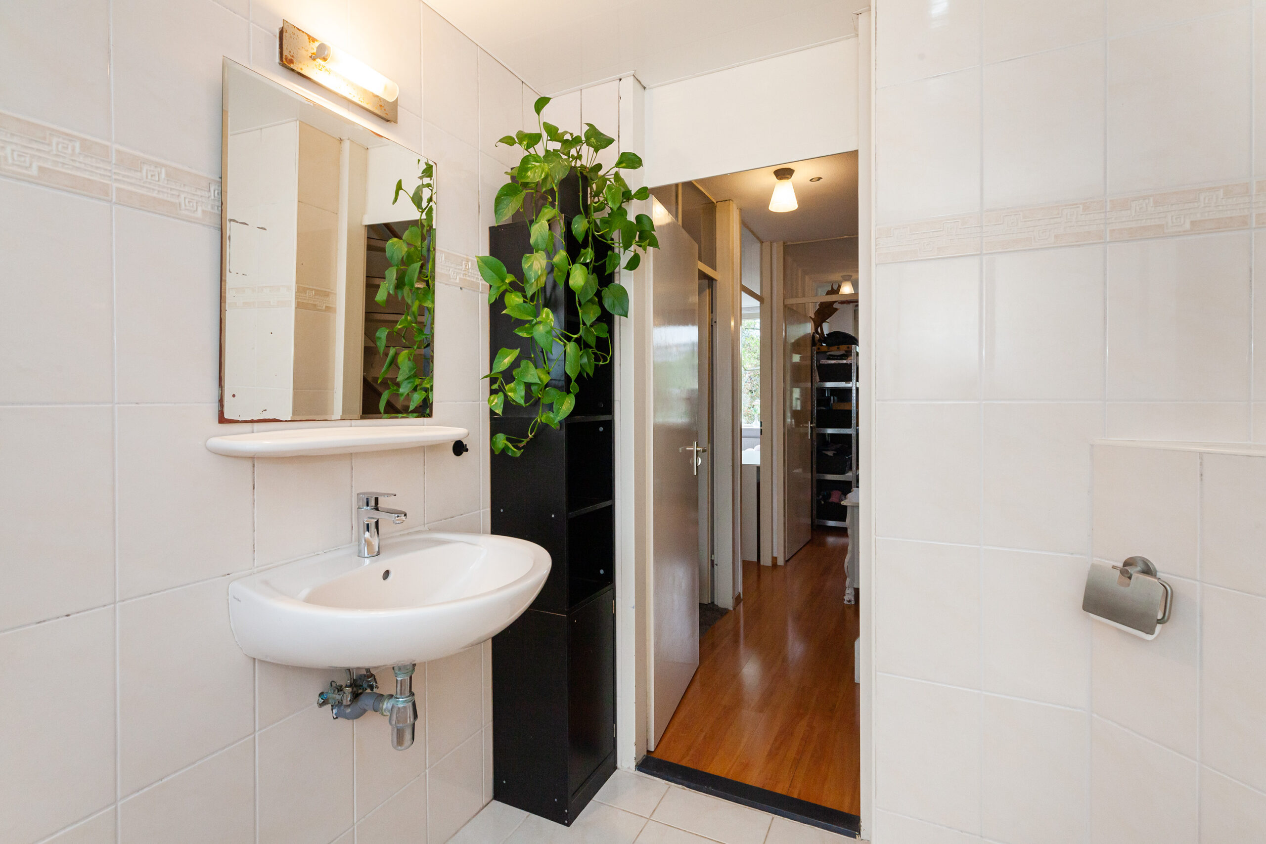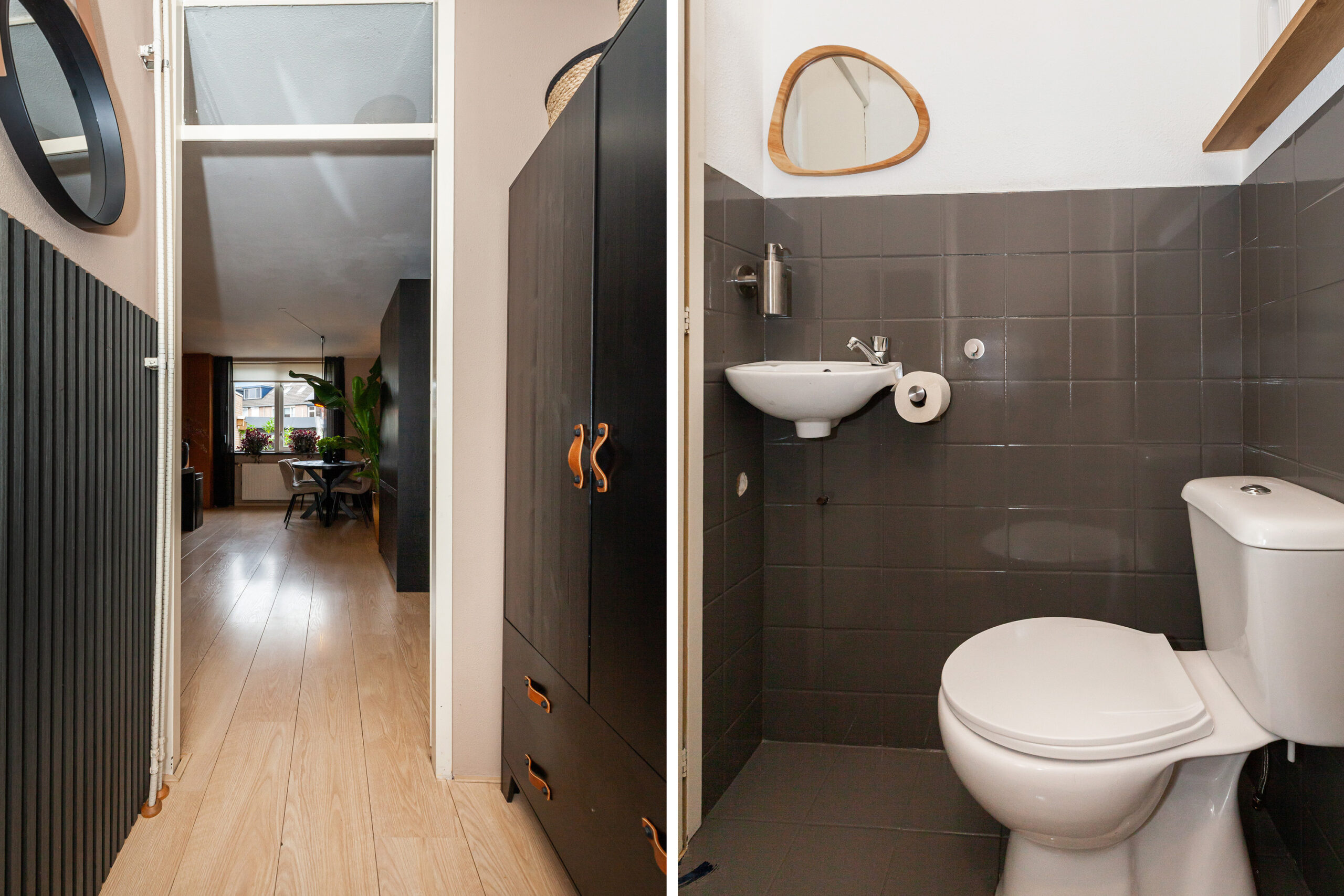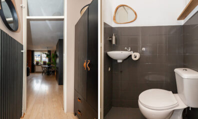 Nette toiletruimte voorzien van een staand toilet en een handwasfonteintje. Er is een deur naar de trapkast waar de C.V.-ketel zich bevindt.