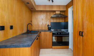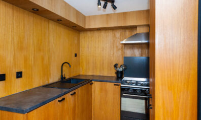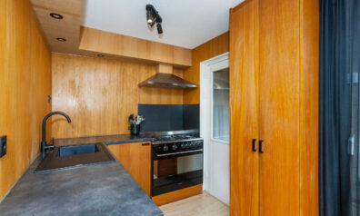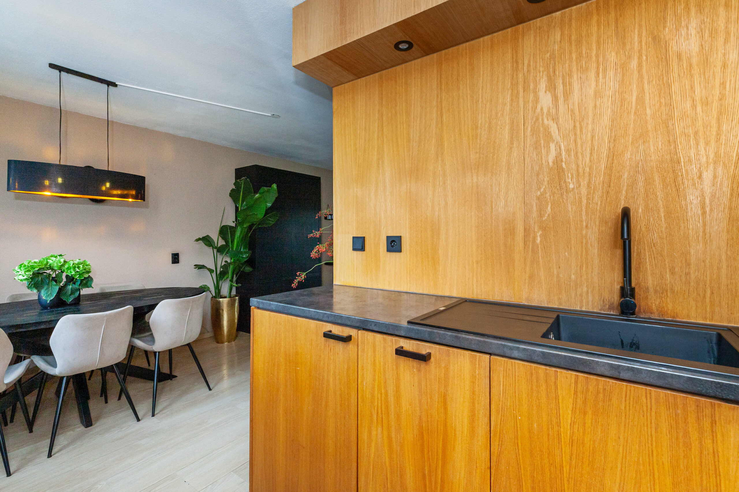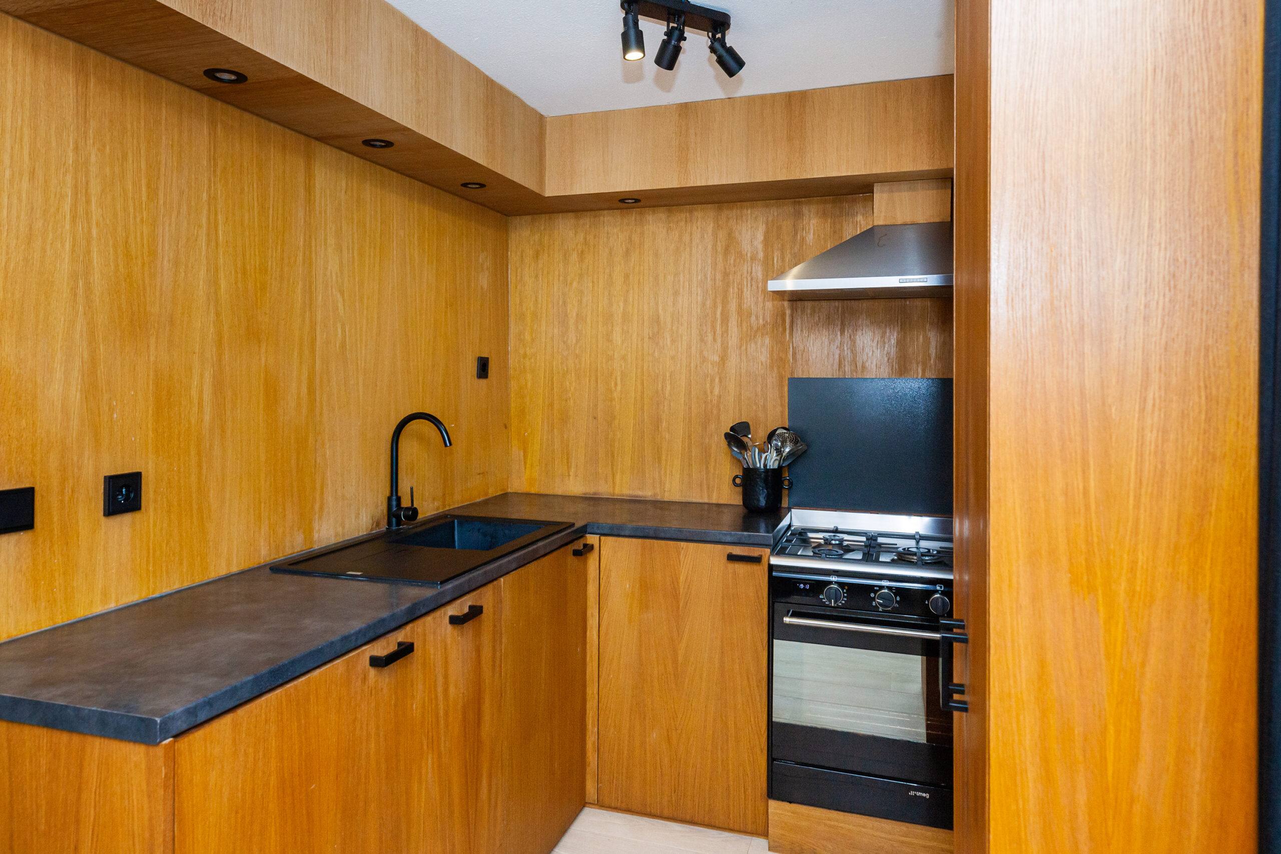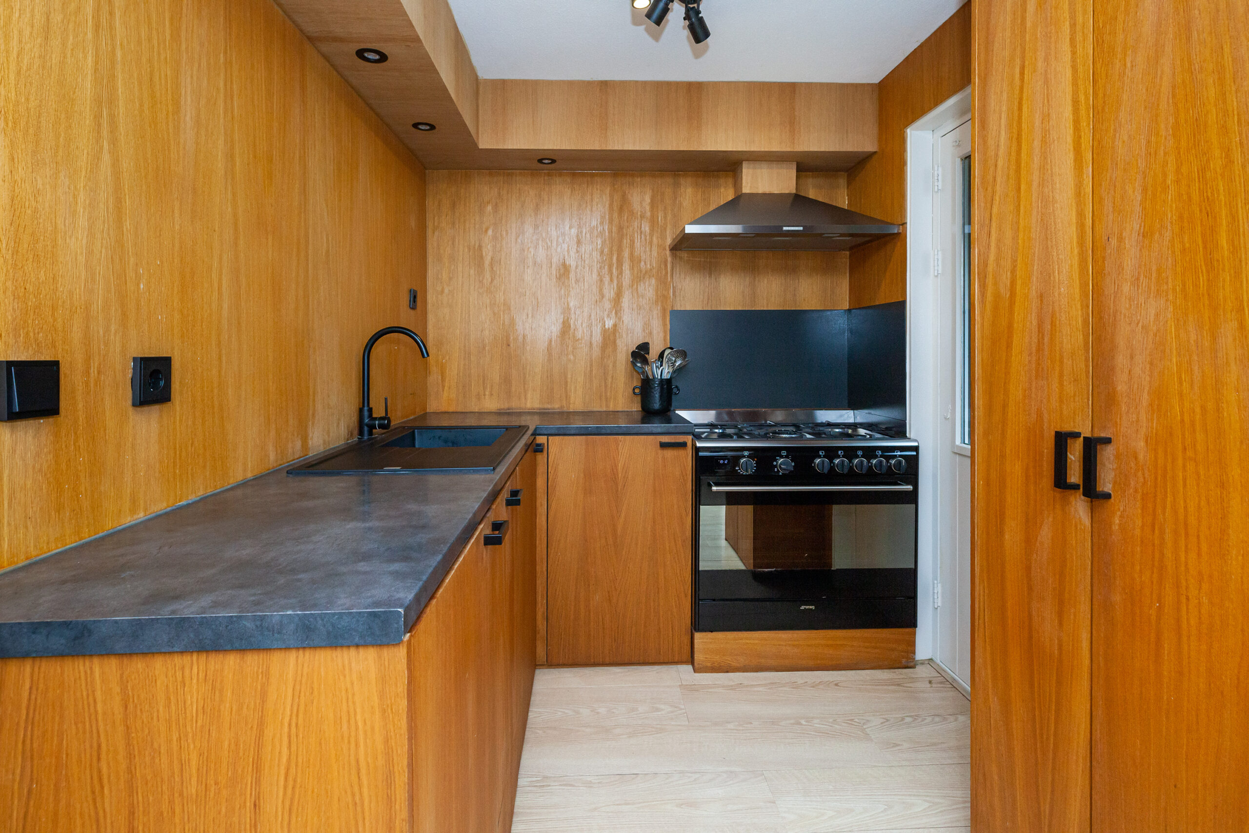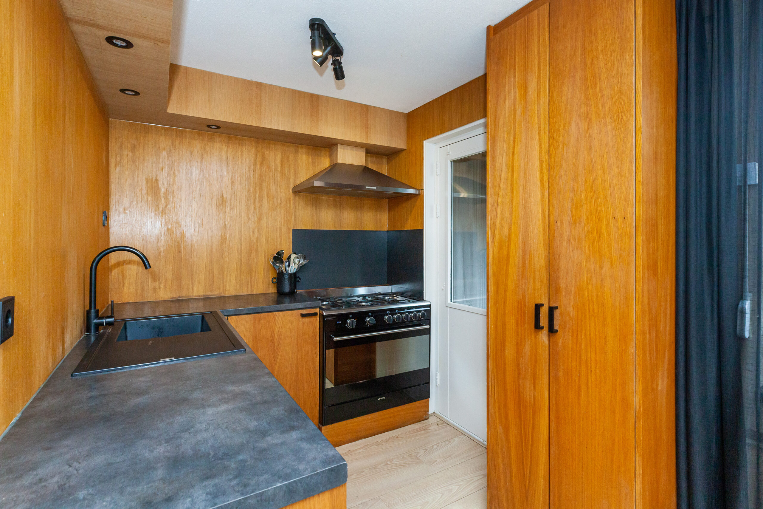 De keuken is gesitueerd aan de achterzijde en in 2022 geplaatst. Aan de hoekopstelling kunt u heerlijk kokkerellen! Aan inbouwapparatuur heeft u de beschikking over een 5-pits gasfornuis met afzuigkap en een grote oven, fijn voor de bakliefhebbers. Daarnaast is er een koelkast en vaatwasser. Vanuit de keuken komt u in het achterportaal.