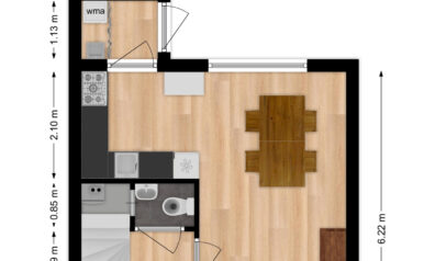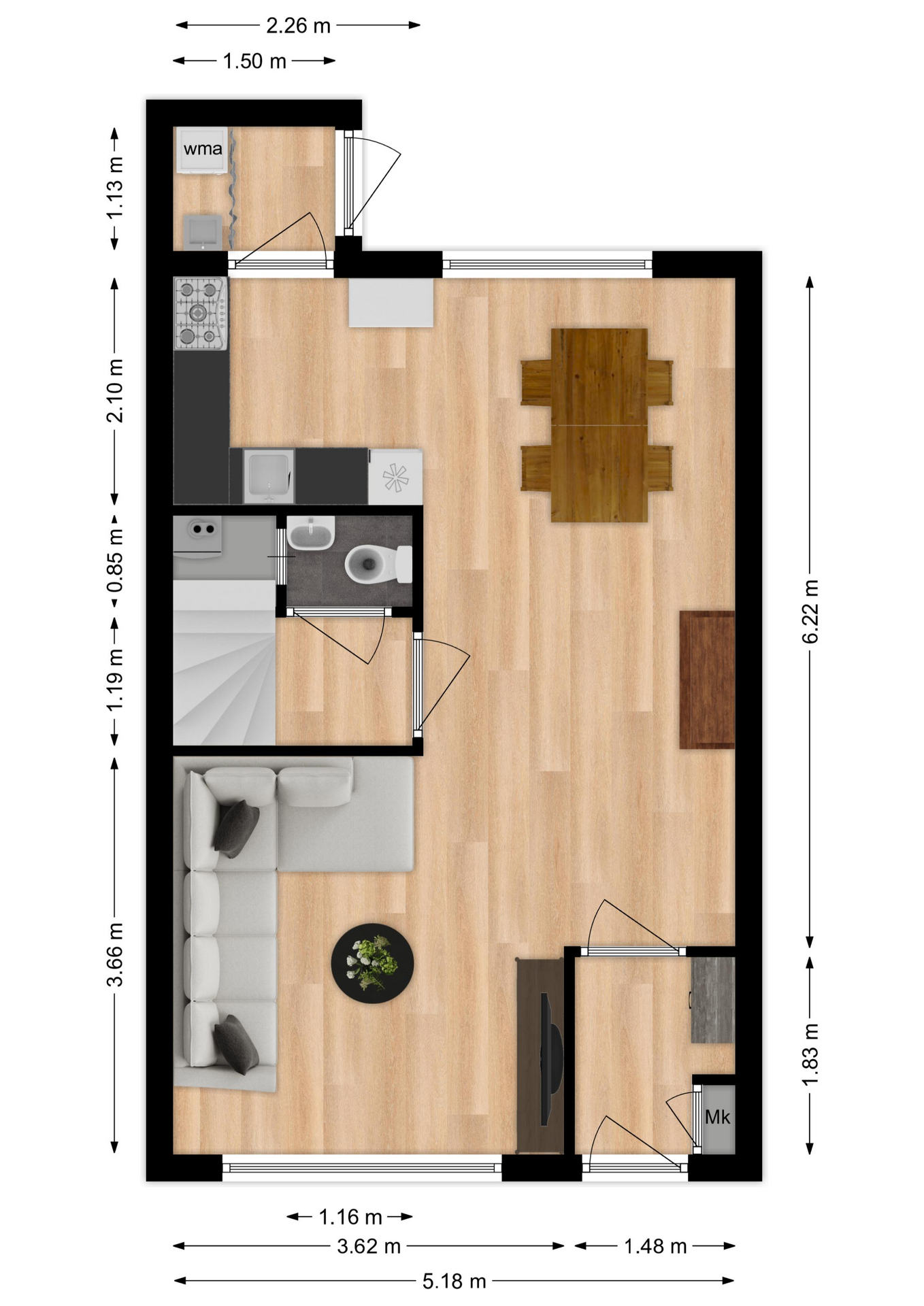 U stapt deze gezellige woning binnen in de ontvangstruimte, de hal. Hier heeft u de meterkast en de toegang tot de woonkamer.
