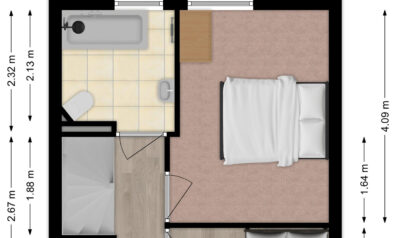 U zult versteld staan van de ruimte op deze verdieping. Dit komt ook mede door de nokhoogte van 2.90m. Aan de voorzijde zijn een tweetal grote tuimelramen en aan beide zijden is er bergruimte onder het schuine dak.